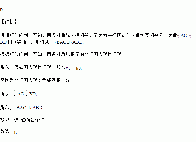 如图,在平行四边形ABCD中,AC、BD是它的两条对角线,下列条件中,能判断这个平行四边形是矩形的是( )
