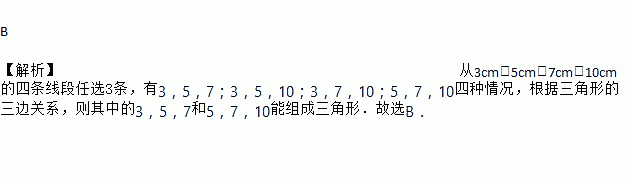 以长为3cm,5cm,7cm,10cm的四条线段中的三条线段为边,可以构成三角形的个数是( )