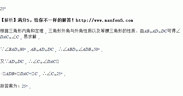 如图,在△ABC中,点D在边BC上,∠BAD=80°,AB= AD=DC,则∠C=__________