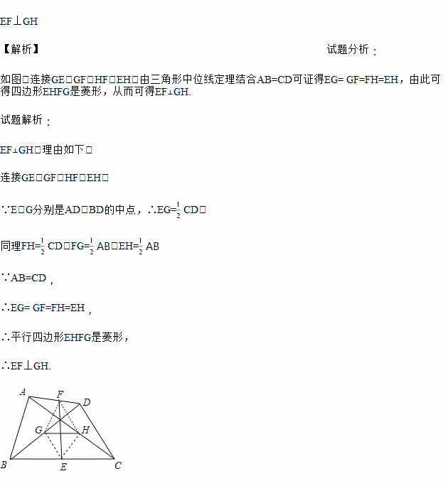 已知:在四边形ABCD中,E、F、G、H分别是BC、AD、BD、AC的中点,AB=CD,