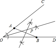 分析:此题应分成两步来作,①首先作∠COD的角平分线,②连接AB,作AB的垂直平分线;那么∠COD的角平分线与AB中垂线的交点即为求作的P点.