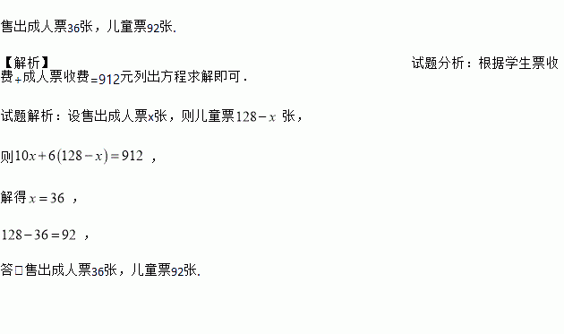 售出成人票36张,儿童票92张. 【解析】试题分析:根据学生票收费+成人票收费=912元列出方程求解即可. 试题解析:设售出成人票x张,则儿童票张, 则, 解得, , 答:售出成人票36张,儿童票92张.