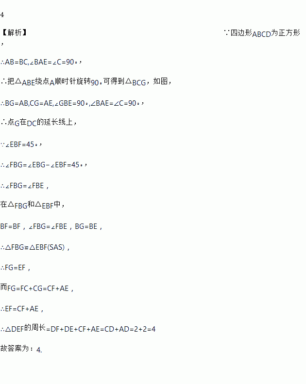 如图,正方形ABCD的边长为2,点E,F分别在边AD,CD上,若∠EBF=45°,则△EDF的周长等于_____.