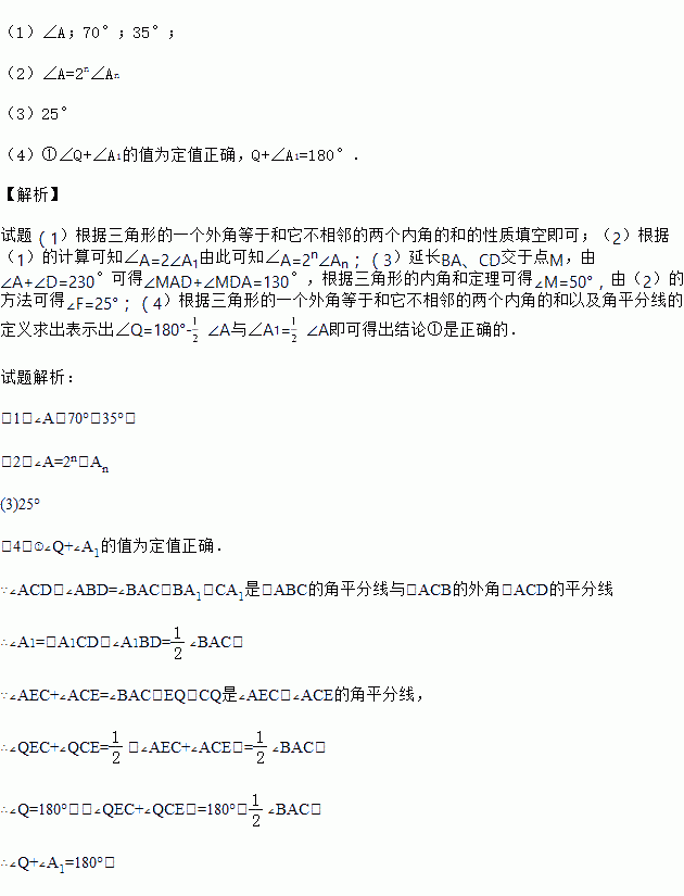 (2)∠A1BC的角平分线与∠A1CD的角平分线交于A2,∠A2BC与A2CD的平分线交于A3,如此继续下去可得A4、…、An,请写出∠A与∠An 的数量关系____________;