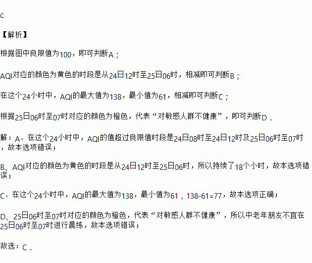 ÈçͼÊÇ2017Ä꺼ÖÝÊÐijÔÂ24ÈÕ08ʱÖÁ25ÈÕ07ʱµÄ¿ÕÆøÖÊÁ¿Ö¸Êýͳ¼ÆÍ¼(¿ÕÆøÖÊÁ¿Ö¸ÊýAQIµÄÖµÔÚ²»Í¬µÄÇø¼ä£¬¾Í´ú±íÁ˲»Í¬µÄ¿ÕÆøÖÊÁ¿Ë®Æ½£®±ÈÈç0¡«50Ö®¼ä£¬´ú±í¡°Á¼ºÃ¡±£¬¶ÔÓ¦µÄÑÕɫΪÂÌÉ«£»51¡«100Ö®¼ä£¬´ú±í¡°Öеȡ±£¬¶ÔÓ¦µÄÑÕɫΪ»ÆÉ«£»101¡«150Ö®¼ä£¬´ú±í¡°¶ÔÃô¸ÐÈËȺ²»½¡¿µ¡±£¬¶ÔÓ¦µÄÑÕɫΪ³ÈÉ«£¬µÈµÈ)£¬Ôò¸ù¾Ýͳ¼ÆÍ¼µÃ³öµÄÏÂÁÐÅжϣ¬ÕýÈ·µÄÊÇ(¡¡¡¡)