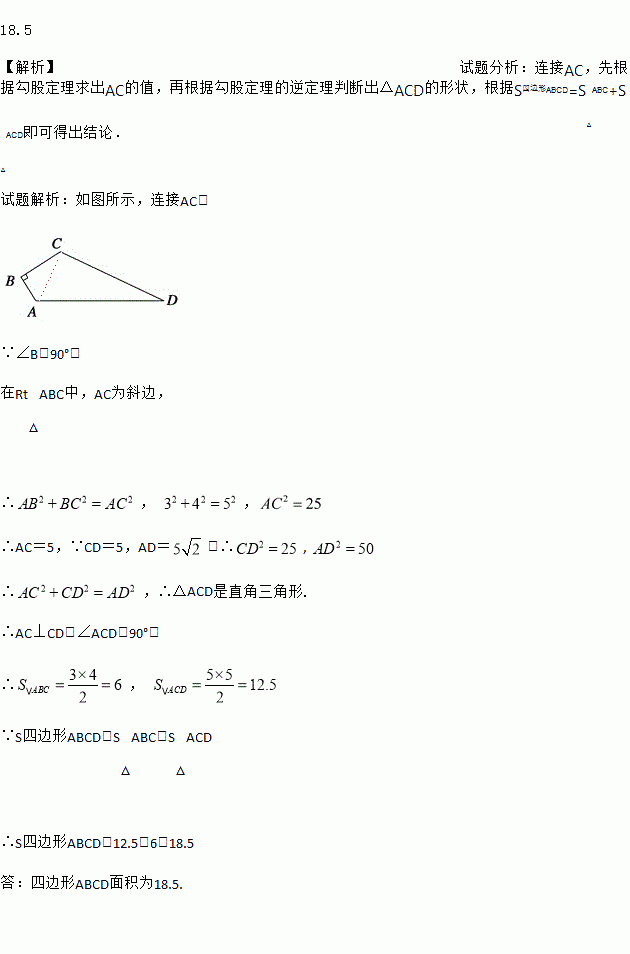 已知:如图,四边形ABCD中,AB=3,BC=4,CD=5,AD=,∠B=90°,求四边形ABCD的面积.