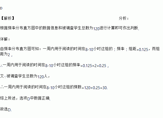 某校120名学生某一周用于阅读课外书籍的时间的频率分布直方图如图所示.其中阅读时间是8~10小时的频数和频率分别是( )