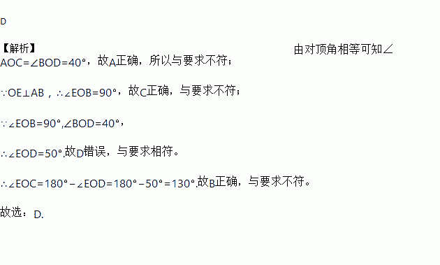 A. ∠AOC=40° B. ∠COE=130° C. ∠BOE=90° D. ∠EOD=40°