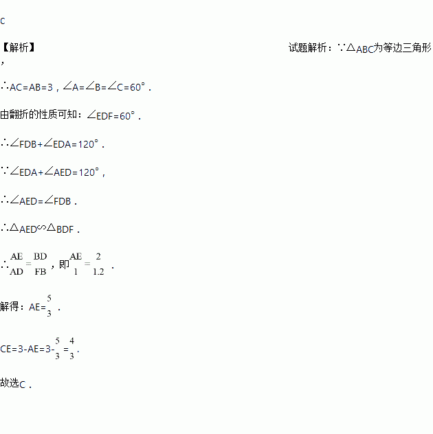 如图,D是等边△ABC边AB上的一点,且AD=1,BD=2,现将△ABC折叠,使点C与点D重合,折痕为EF,点E、F分别在AC和BC上,若BF=1.2,则CE的长为