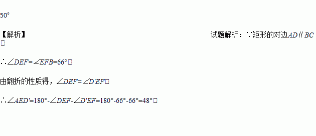 如图,小章利用一张左、右两边已经破损的长方形纸片 ABCD 做折纸游戏,他将纸片沿EF折叠后,D、C两点分别落在D′、C′的位置,并利用量角器量得∠EFB =65°,则∠AED′等于_______。