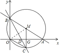 (1)证明:∵∠COD=∠OBC,∴,∵点M是圆心,∴由垂径定理的推论得:MC⊥OA;(2)解:∵MC⊥OA,∴OG=GA=OA,∵点M是圆心,∴BM=AM,∴GM是△AOB的中位线,∴GM=OB,∵y=﹣x+与x轴、y轴分别交于A、B两点,∴当x=0时,y=,当y=0时,x=3,∴B(0,),A(3,0)∴OB=,OA=3,∴MG=,OG=,连接OM,在Rt△OGM中,由勾股定理得:OM=,∴GC=﹣=,∵点C在第三象限,∴C(,﹣).设直线BC的解析式为:y=kx+b,∴,解得:,∴直线BC的解析式为:y=﹣x+.