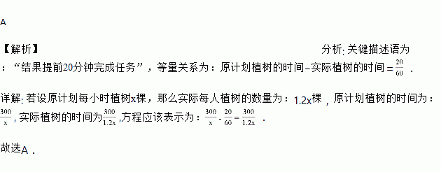 为响应承办“绿色奥运”的号召,九年级(1)班全体师生义务植树300棵.原计划每小时植树x棵,但由于参加植树的全体师生植树的积极性高涨,实际工作效率提高为原计划的1.2倍,结果提前20分钟完成任务.则下面所列方程中,正确的是( )
