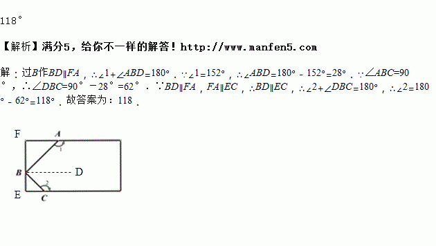 如图,有一个长方形纸片,减去相邻的两个角,使∠ABC=90°,如果∠1=152°,那么∠2=_____________°.