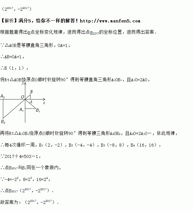 在平面直角坐标系xOy中,有一个等腰直角三角形AOB,∠OAB=90°,直角边AO在x轴上,且AO=1.将Rt△AOB绕原点O顺时针旋转90°得到等腰直角三角形A1OB1,且A1O=2AO,再将Rt△A1OB1绕原点O顺时针旋转90°得到等腰三角形A2OB2,且A2O=2A1O…,依此规律,得到等腰直角三角形A2017OB2017.则点B2017的坐标是____________.