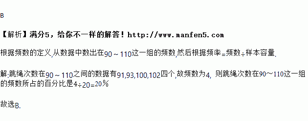 某班大课间活动抽查了20名学生每分钟跳绳次数,获得如下数据(单位:次):50,63,77,83,87,88,89,91,93,100,102,111,117,121,130,133,146,158,177,188,则跳绳次数在90~110这一组的频数所占的百分比是( )