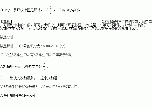 号的5名学生进行定点投篮,规定每人投5次,每命中1次记1分,没有命中记0分.如图是根据他们各自的累积得分绘制的条形统计图,之后来了第6号学生也按同样记分规定投了5次,其命中率为