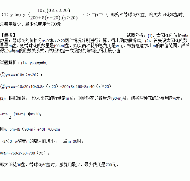ij»¨»Ü»ùµØ³öÊÛÁ½ÖÖÅèÔÔ»¨»Ü£ºÌ«Ñô»¨µÄ¼Û¸ñΪ6Ôª/Å裬ÐåÇò»¨µÄ¼Û¸ñΪ10Ôª/Å裮ÈôÒ»´ÎÐÔ¹ºÂòÐåÇò»¨³¬¹ý20Åèʱ£¬³¬¹ý20ÅèµÄ²¿·ÖÐåÇò»¨´ò8ÕÛ£®