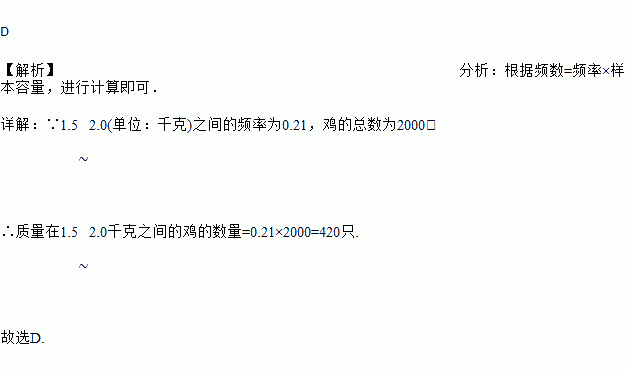 把养鸡场的一次质量抽查情况作为样本,样本数据落在2.0~2.5(单位:千克)之间的频率为0.21,于是可估计这个养鸡场的2000只鸡中,质量在2.0~2.5千克之间的鸡的只数是( )