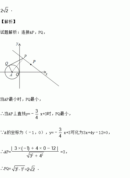 如图,在直角坐标系中,⊙A的圆心A的坐标为(-1,0),半径为1,点P为直线上的动点,过点P作⊙A的切线,切点为Q,则切线长PQ的最小值是__________