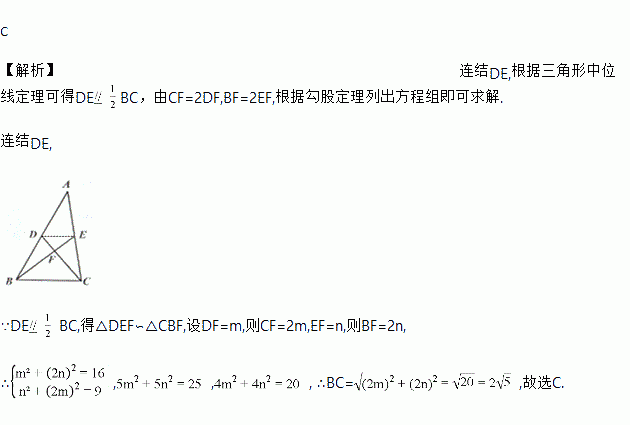 如图,△ABC中,D,E分别为AB,AC的中点,CD⊥BE于点F.当AB=8,AC=6时,BC的长度为( )