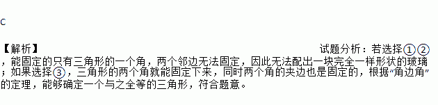 C 【解析】试题分析:若选择①②,能固定的只有三角形的一个角,两个邻边无法固定,因此无法配出一块完全一样形状的玻璃;如果选择③,三角形的两个角就能固定下来,同时两个角的夹边也是固定的,根据“角边角”的定理,能够确定一个与之全等的三角形,符合题意。