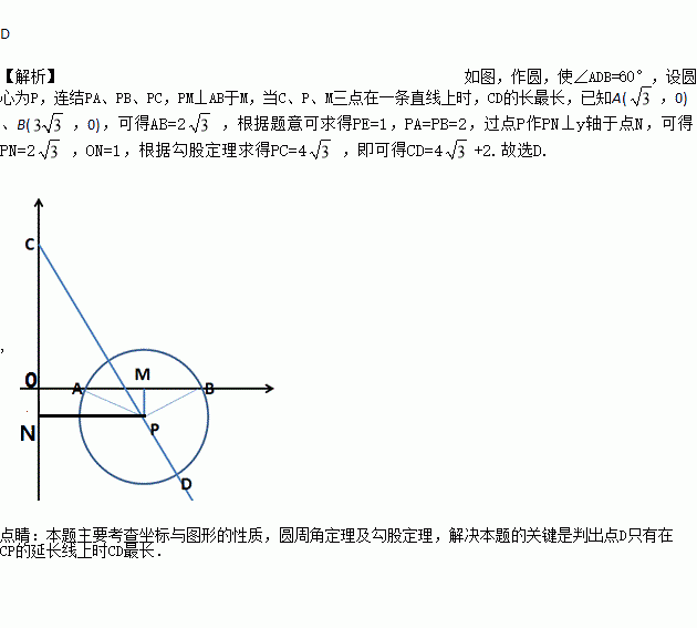 ,0)、C(0,5),点D在直角坐标系中,且∠ADB=60°,则线段CD的长的最大值为( )