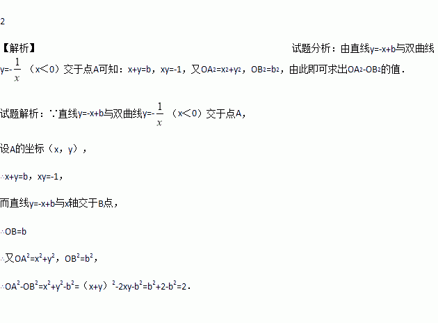 如图,直线y=﹣x+b与双曲线y=﹣(x<0)交于点A,与x轴交于点B,则OA2﹣OB2=_____.