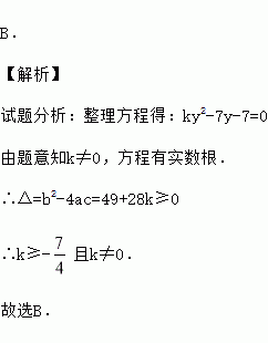 若关于y的一元二次方程ky2-4y-3=3y+4有实根,则k的取值范围是( )