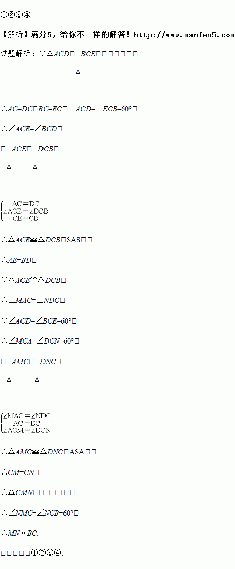 如图,点C在AB上,△DAC、△EBC均是等边三角形,AE、BD分别与CD、CE交于点M、N,则下列结论:①AE=DB;②CM=CN;③△CMN为等边三角形;④MN//BC;