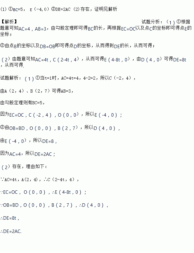 (1) ①BC=5, E(-4,0)②DE=2AC (2)存在,证明见解析 【解析】试题分析:(1)①根据题意可知AC=4,AB=3,由勾股定理即可得BC的长,再根据EC=OC以及点C的坐标即可得点E的坐标; ②由点B的坐标以及DB=OB即可得点D的坐标,从而得到DE的长,从而可得; (2)由题意可知AC=4t,C(2-4t,4),从而可得E(4-8t,0),由D(4,0)可得D...