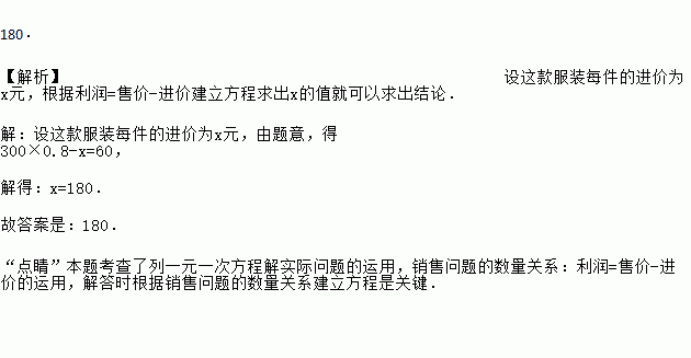 服装店销售某款服装,一件服装的标价为300元,若按标价的八折销售,仍可获利60元,则这款服装每件的进价是______元.