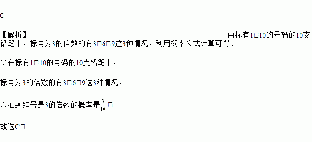 笔筒中有10支型号、颜色完全相同的铅笔,将它们逐一标上1﹣10的号码,若从笔筒中任意抽出一支铅笔,则抽到编号是3的倍数的概率是( )