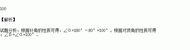 若∠α与∠β是对顶角,∠α的补角为80°,则∠β= °.