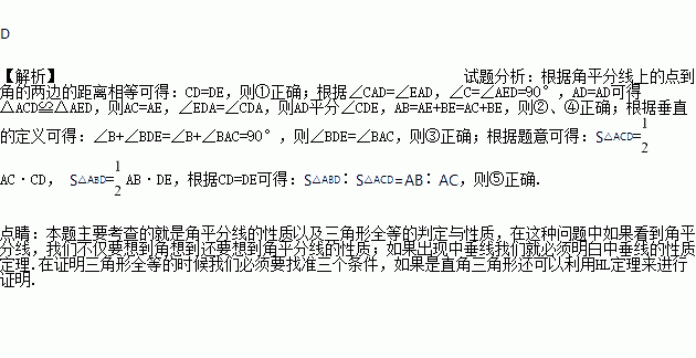 如图,在△ABC中,∠C=90°,AD平分∠BAC,DE⊥AB于E,有下列结论:①CD=ED②AC+BE=AB ③∠BDE=∠BAC ④AD平分∠CDE ⑤S△ABD∶S△ACD=AB∶AC,其中正确的有( )