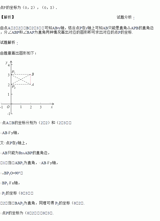 在平面直角坐标系内,已知点A(2,2).B(2,3),点P在y轴上,且三角形APB为直角三角形,求点P的坐标.