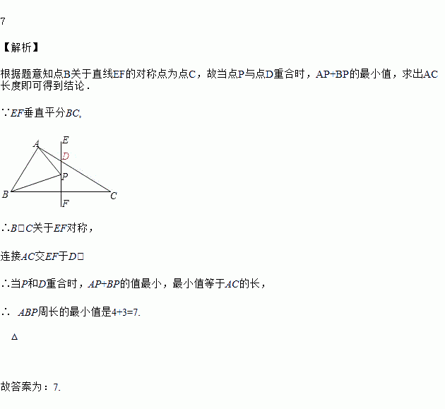 如图,在△ABC中,AB=3,AC=4,BC=5,EF垂直平分BC,点P为直线EF上一动点,则△ABP周长的最小值是_____.
