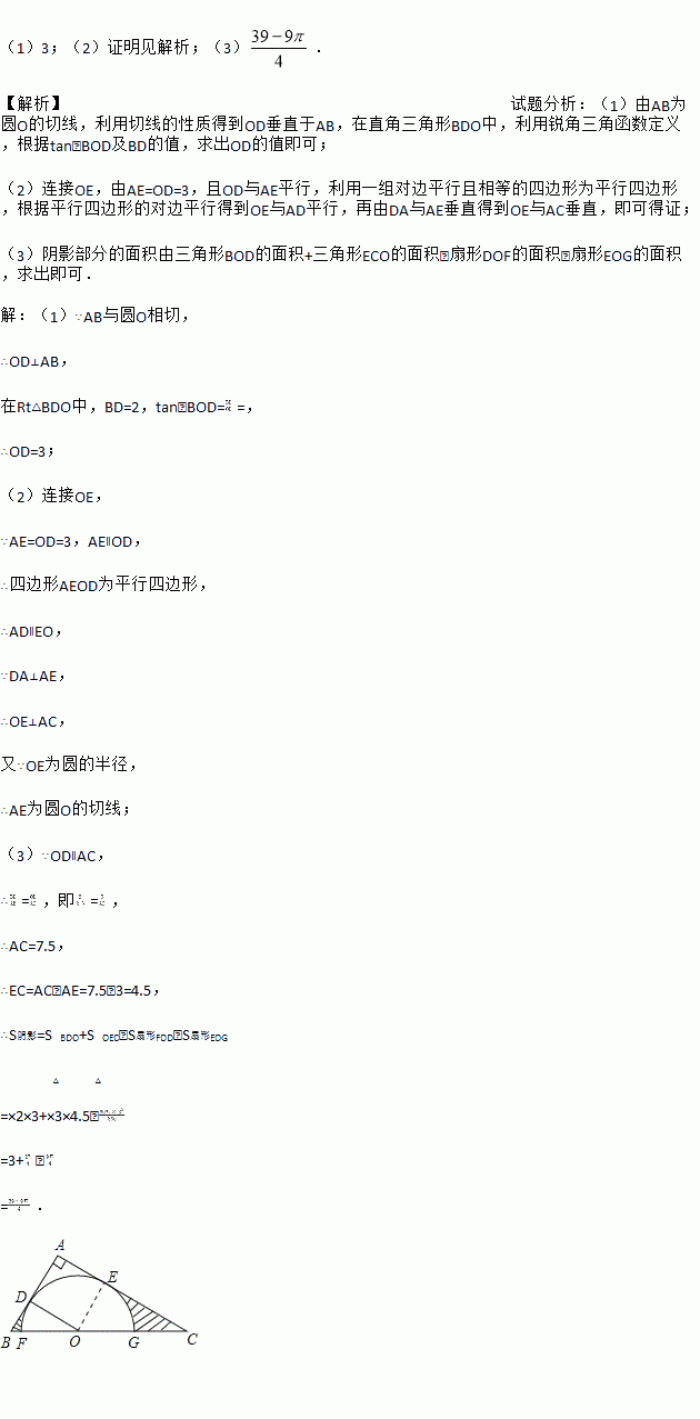 如图,在Rt△ABC中,∠A=90°,O是BC边上一点,以O为圆心的半圆与AB边相切于点D,与AC、BC边分别交于点E、F、G,连接OD,已知BD=2,AE=3,tan∠BOD=.