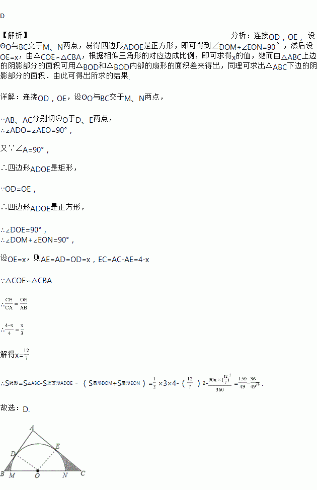 如图,在Rt△ABC中,∠A=90°,AB=3,AC=4,以O为圆心的半圆分别与AB、AC边相切于D、E两点,且O点在BC边上,则图中阴影部分面积S阴等于( )