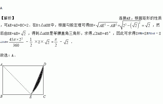 在矩形ABCD中,AB=,BC=2,以A为圆心,AD为半径画弧交线段BC于E,连接DE,则阴影部分的面积为( )