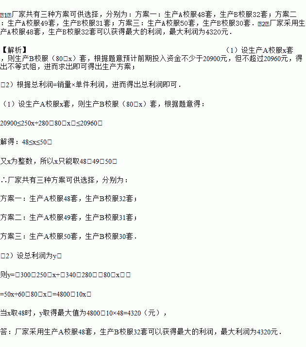 某校服生产厂家计划在年底推出80套两款新校服A和B,预计前期投入资金不少于20900元,但不超过20960元,且所投入资金全部用于两种校服的研制,其成本和售价如下表: