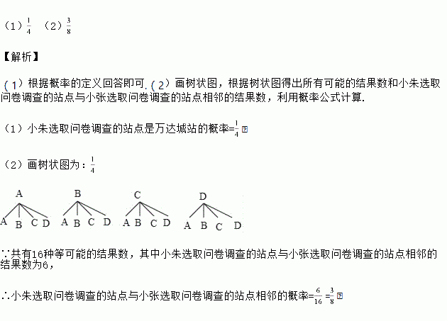 (1)在这四站中,小朱选取问卷调查的站点是万达城站的概率是多少?