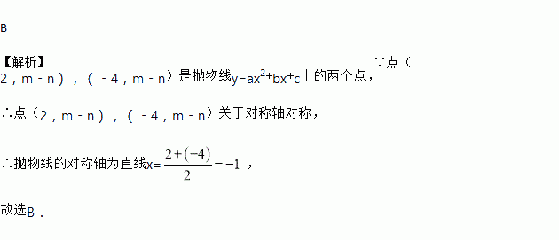 B 【解析】∵点(2,m﹣n),(﹣4,m﹣n)是抛物线y=ax2+bx+c上的两个点, ∴点(2,m﹣n),(﹣4,m﹣n)关于对称轴对称, ∴抛物线的对称轴为直线x=, 故选B.