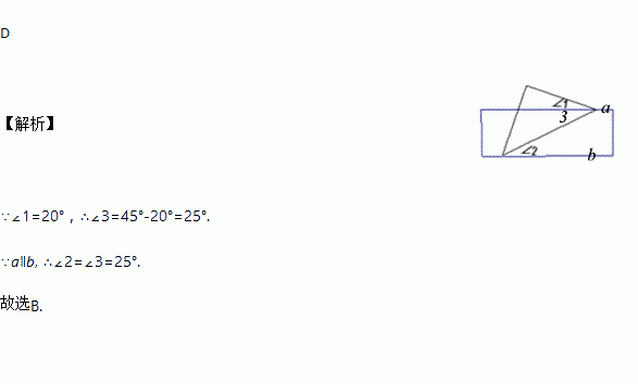 如图,把一块含有45°角的直角三角板的两个顶点放在直尺的对边上,如果∠1=20°,那么∠2等于( )