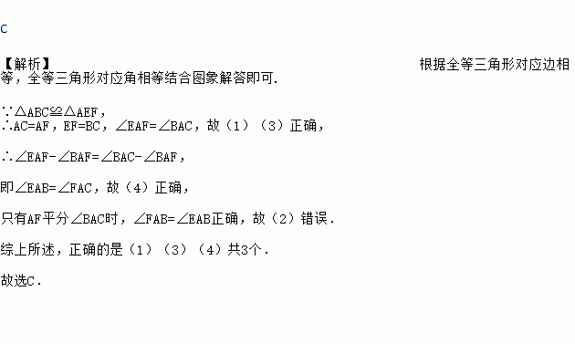 Èçͼ,¡÷ABC¡Õ¡÷AEF,AB=AE,¡ÏB=¡ÏE,Ôò¶ÔÓÚ½áÂÛ:¢ÙAC=AF;¢Ú¡ÏFAB=¡ÏEAB;¢ÛEF=BC;¢Ü¡ÏEAB=¡ÏFAC.ÆäÖÐÕýÈ·½áÂ۵ĸöÊýÊÇ(¡¡¡¡)