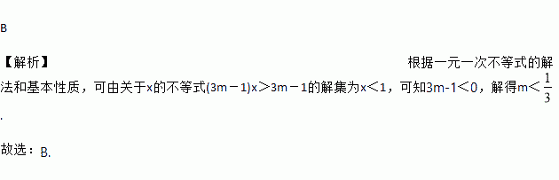 如果关于x的不等式(3m-1)x>3m-1的解集为x<1,那么m的取值范围是( )