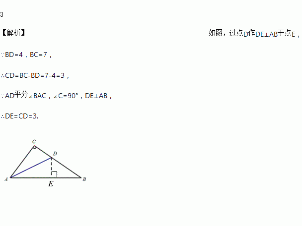 如图,在△ABC中,∠C=90°,AD平分∠BAC交BC于点D,若BC=7,BD=4,则点D到AB的距离为________.