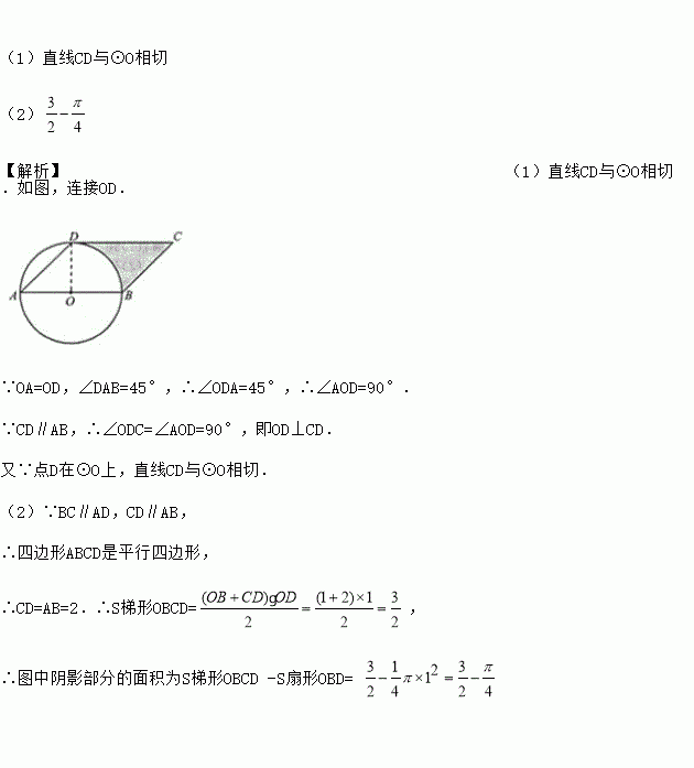 如图,AB是⊙O的直径,点D在⊙O上,∠DAB=45°,BC∥AD,CD∥AB.