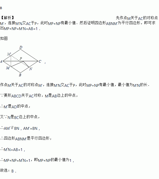如图,点P是边长为1的菱形ABCD对角线AC上的一个动点,点M,N分别是AB,BC边上的中点,则MP+PN的最小值是( )