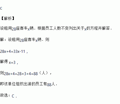 某单位元旦期间组织员工到正定出游,原计划租用28座客车若干辆,但有4人没有座位,若租用同样数量的33座客车,只有一辆空余了11个座位,其余客车都已坐满,则该单位组织出游的员工有( )