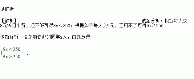 某班同学去春游花了250元包租了一辆客车,如果参加春游的同学每人交8元钱租车费,还不够,如果每人交9元,还用不了.用不等式表示出上述问题中存在的不等关系.